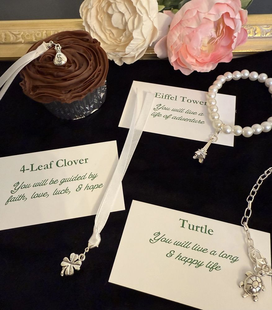 Today, the cake charm tradition is lovingly revived: charms tied with satin ribbon are tucked inside cakes or cupcakes. Each guest takes a ribbon… and together, the moment unfolds.